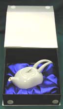 Designed and manufactured by the famous Lu Yu Art Institute in Taipei, Taiwan, the "Capricorn" (December 22 - January 19) tea pot is for those with birthdays between December 22 to January 19. The teapot is symbolic of the Sea Goat or Carpricorn. This very light greenish white glazed teapot comes in a silver triangle case lined with blue satin. Lu Yu teapots are known for their outstanding attention to the fit and finish of the piece. This teapot is made from white clay and has a very light turquoise glaze on the outside. This tea pot is ideal for serving semi-fermented teas such as Oolong, King's, Pouchong, and Ti Kuan Yin.