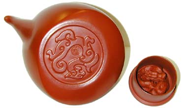 TenRen's "Large Tiger and Mysterious Dragon" Red teapot is one of the larger Yixing type teapots. This beautifully simple yet well crafted teapot has been designed to resemble a tiger from the outside. Under the lid of the teapot and on the base of our teapot are our mysterious hiding dragons. This teapot holds about 19 fluid ounces (580 ml.) of water and is about 6.75 inches (17 cm) in length, its base is about 5 inches (12.5 cm) in diameter, and its height is about 4 inches (10 cm).